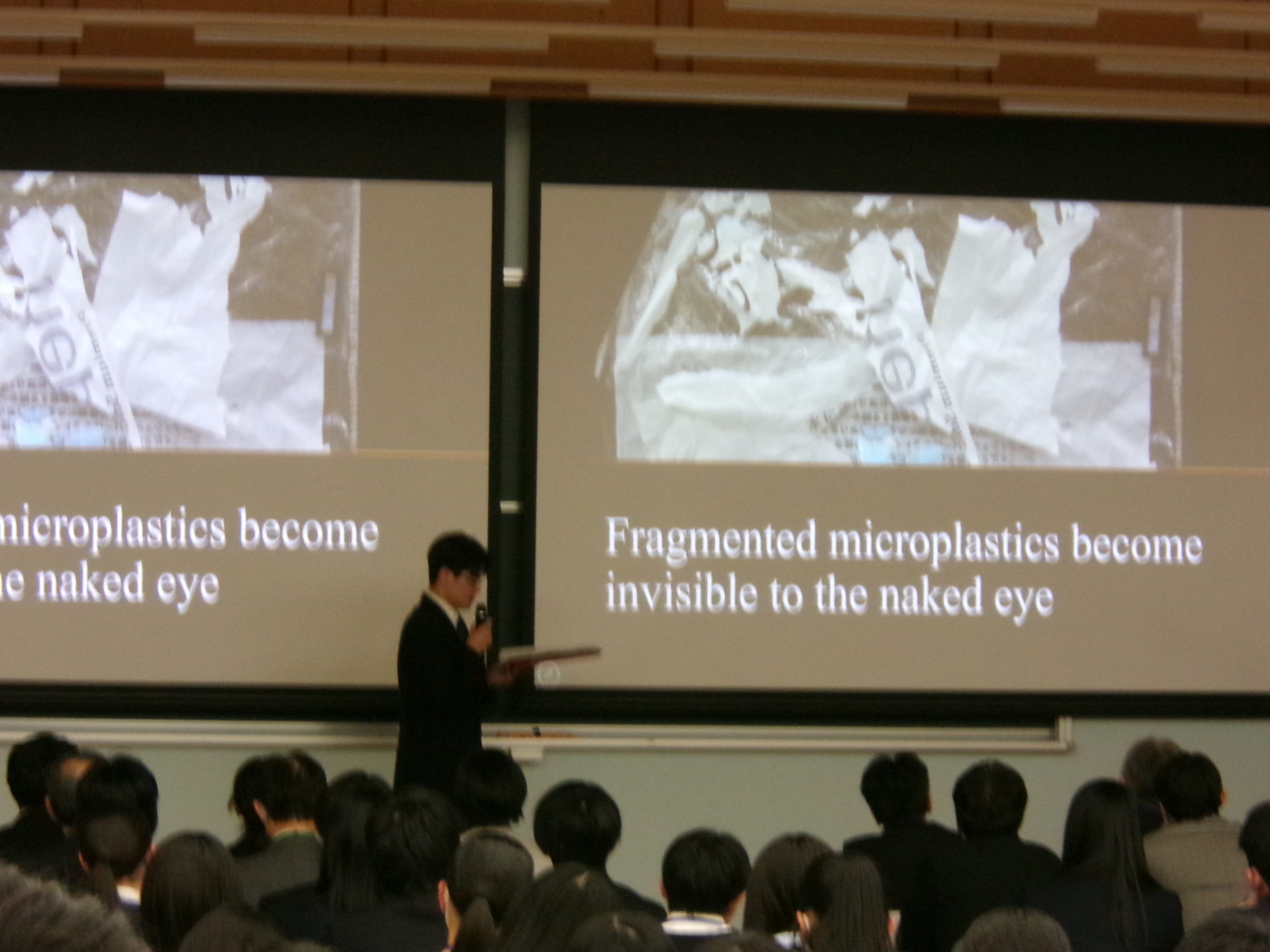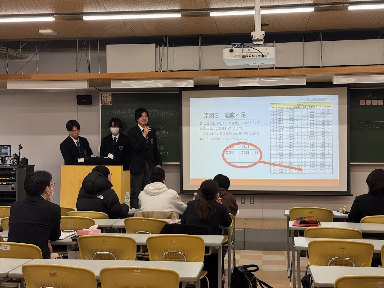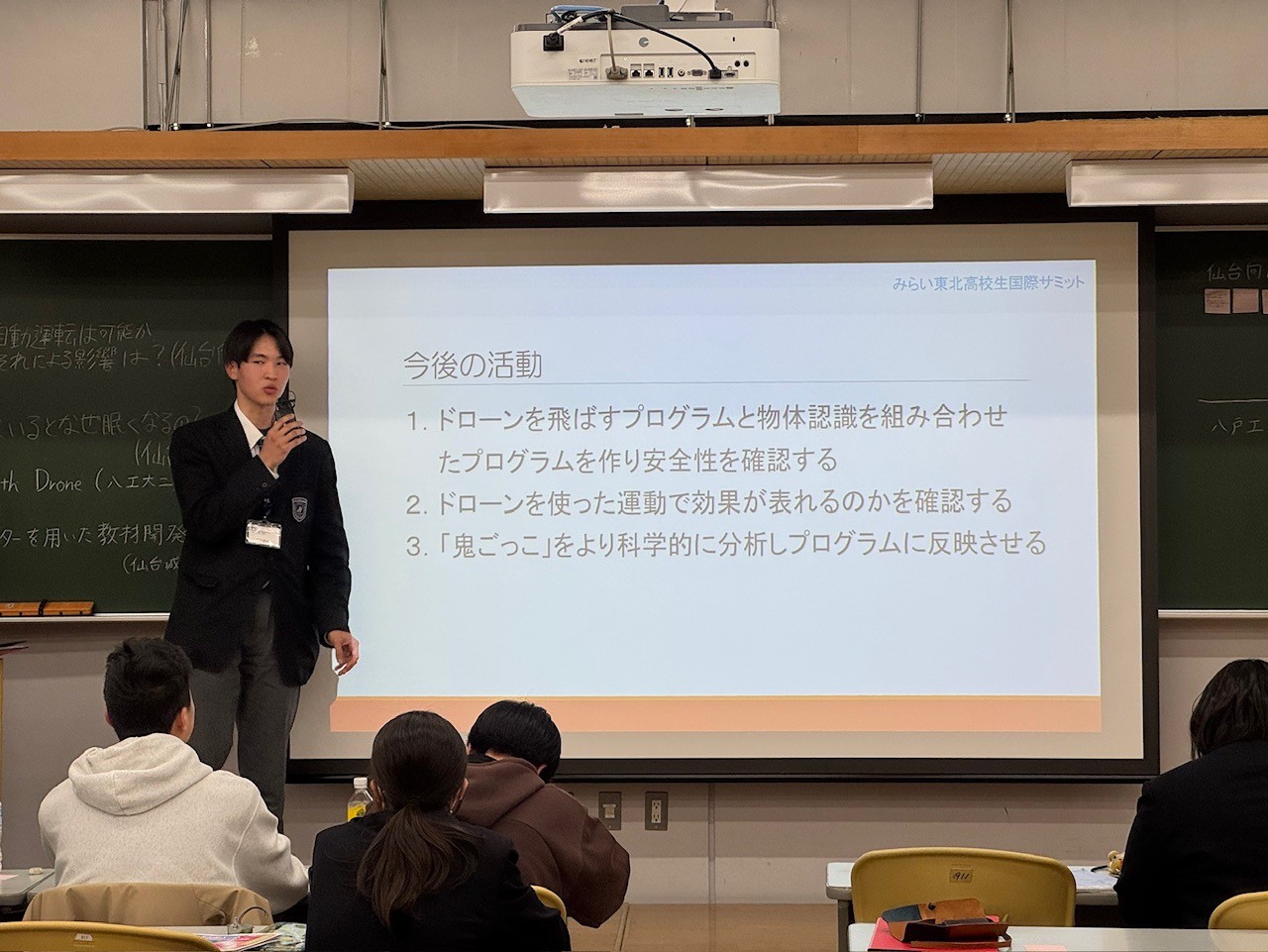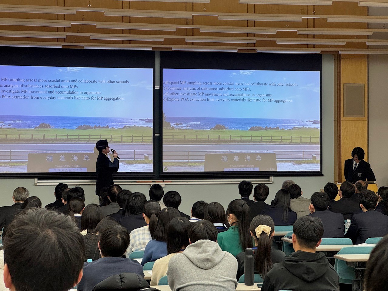 高校生が社会の課題について意見を交わす、みらい東北高校生国際サミットが3月13日、14日二日間の日程で仙台市の東北工業大学で行われました。東北6県や台湾の高校生ら約170人が参加し、各高校の探究活動を報告しました。本校の生徒達は海洋汚染の要因のマイクロプラスチックをテーマに選び、地元の海岸で採取した砂の分析や、マイクロプラスチックを海水から除去する取り組みを英語でプレゼンテーションを行いました。2日目はワークショップが行われ、司会を担当するなどサミットの運営にも貢献し、多くの方から高い評価をいただきました。発表者は以下の通りです。