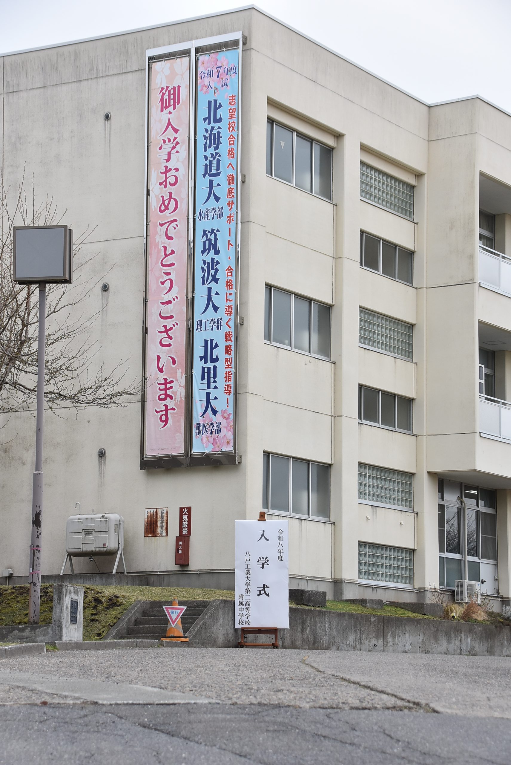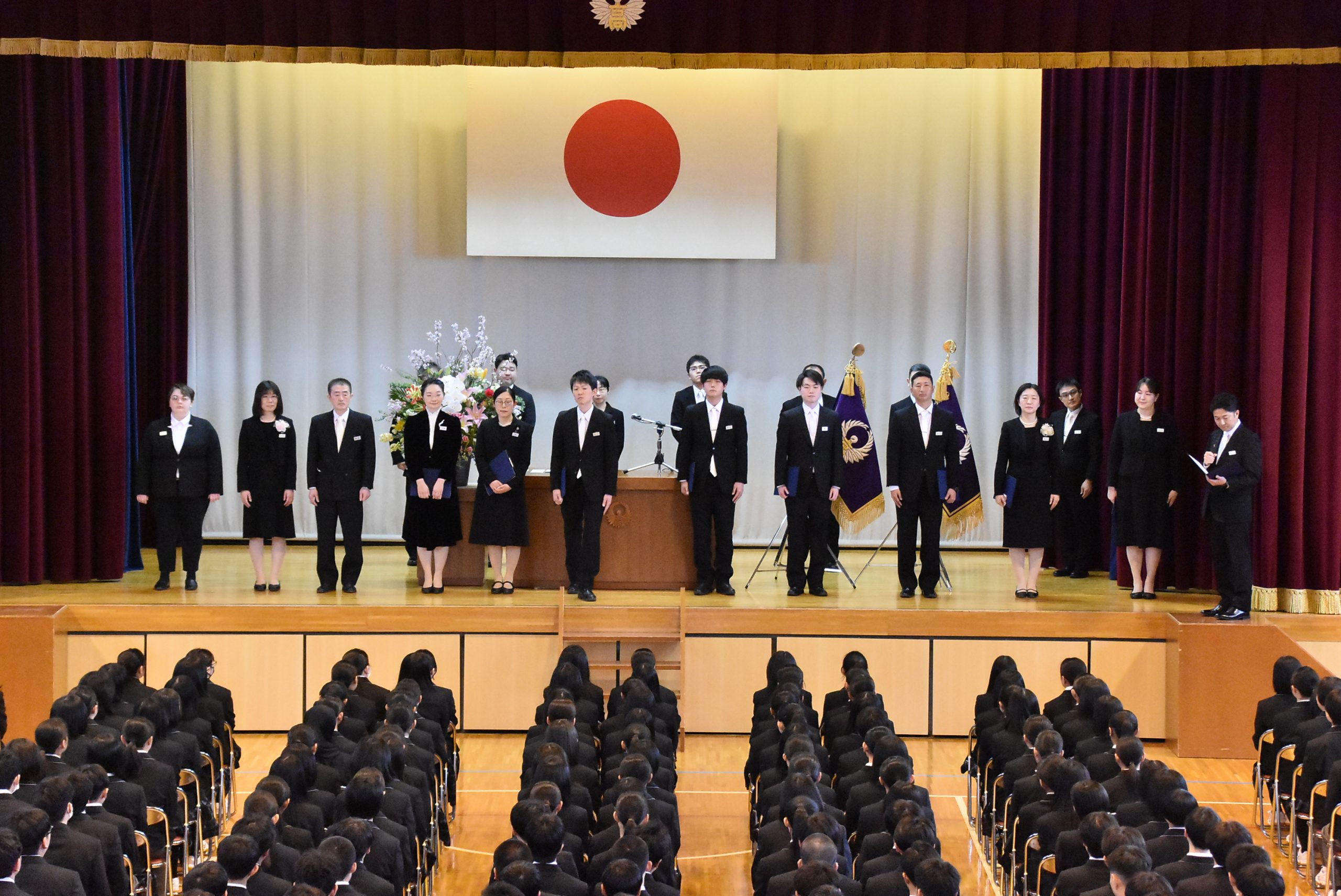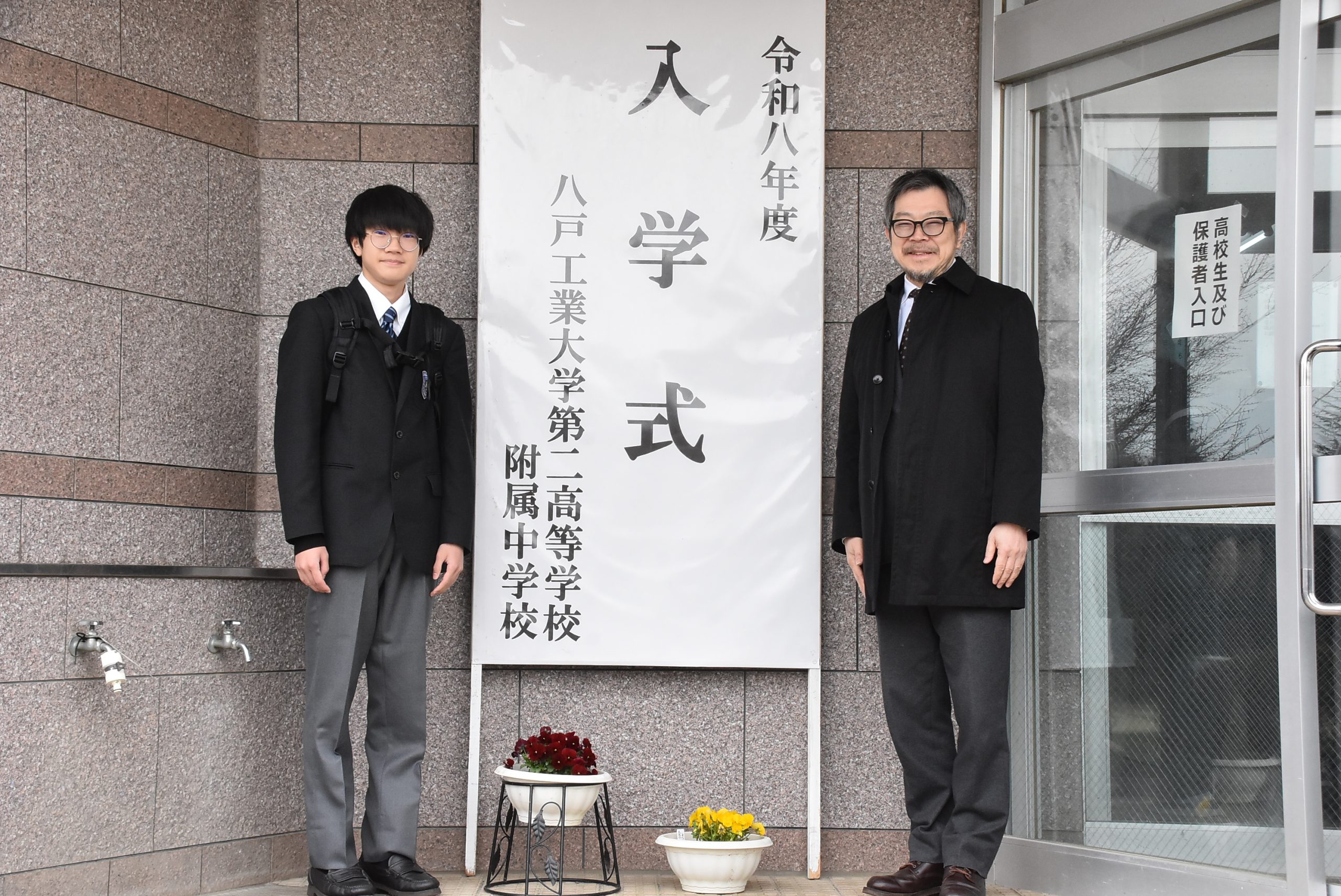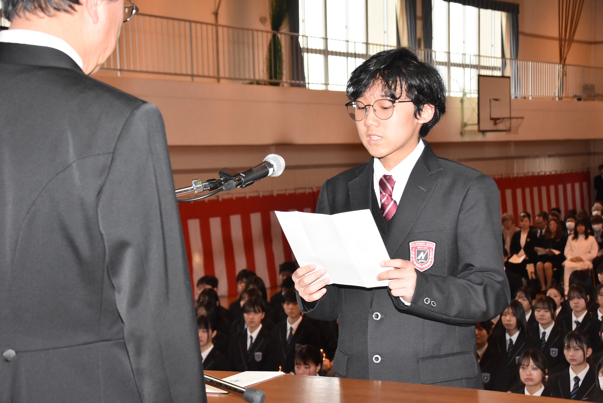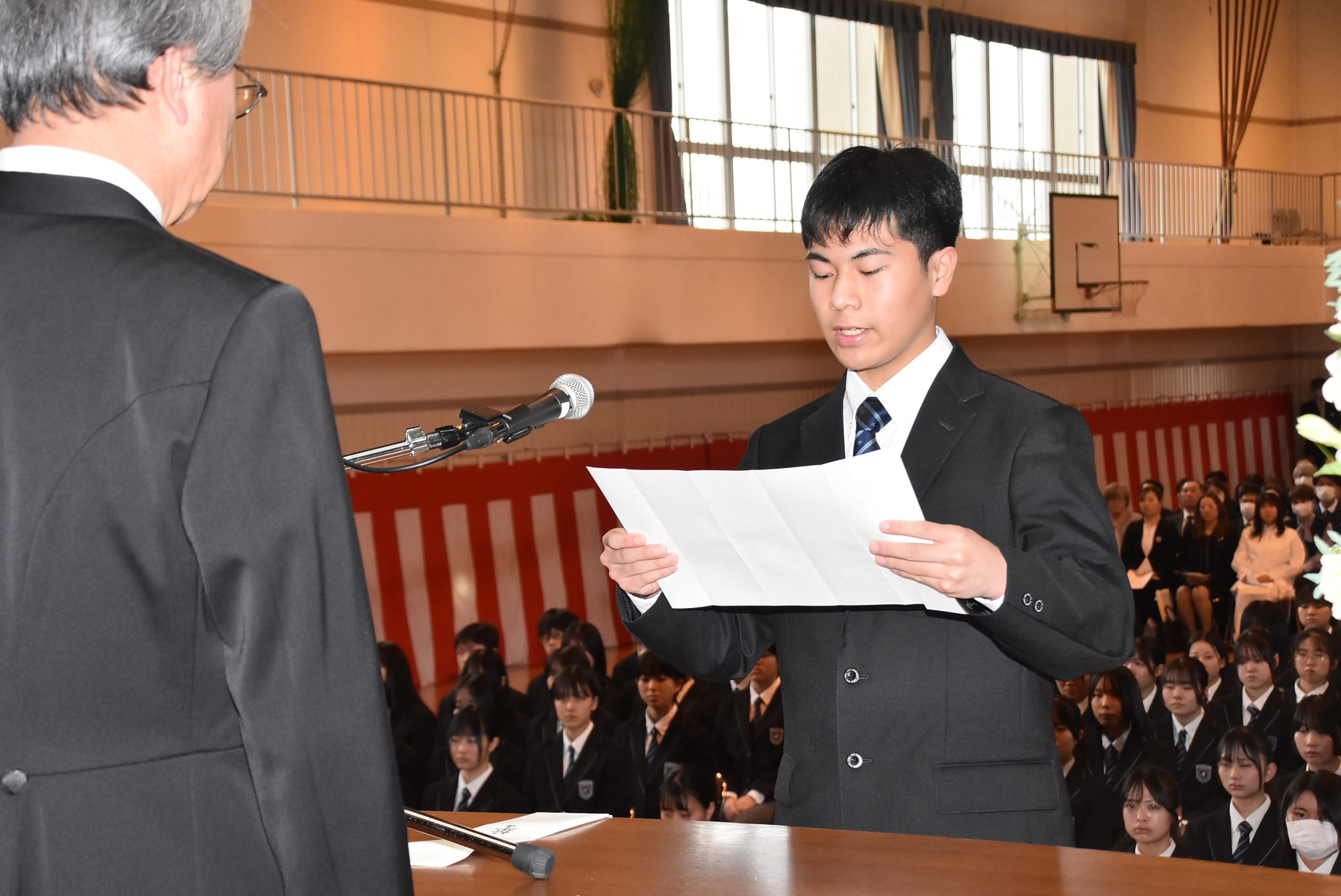 令和8年4月7日(火)に高等学校と附属中学校入学式が本校第二体育館で執り行われ、高等学校212名、附属中学校24名が入学しました。校長先生による祝辞、理事長の告辞の後、新入生を代表し附属中学校 髙橋杜蒼さん(町畑小出身)、高等学校 鈴木歩人さん(田子中出身)が校長先生へ新入生宣誓を、生徒会長の高橋晴夏さんが歓迎の言葉を新入生に伝えました。入学生は「入学式」と大書された看板の前で保護者らと記念撮影をするなど、入学を喜んでいました。